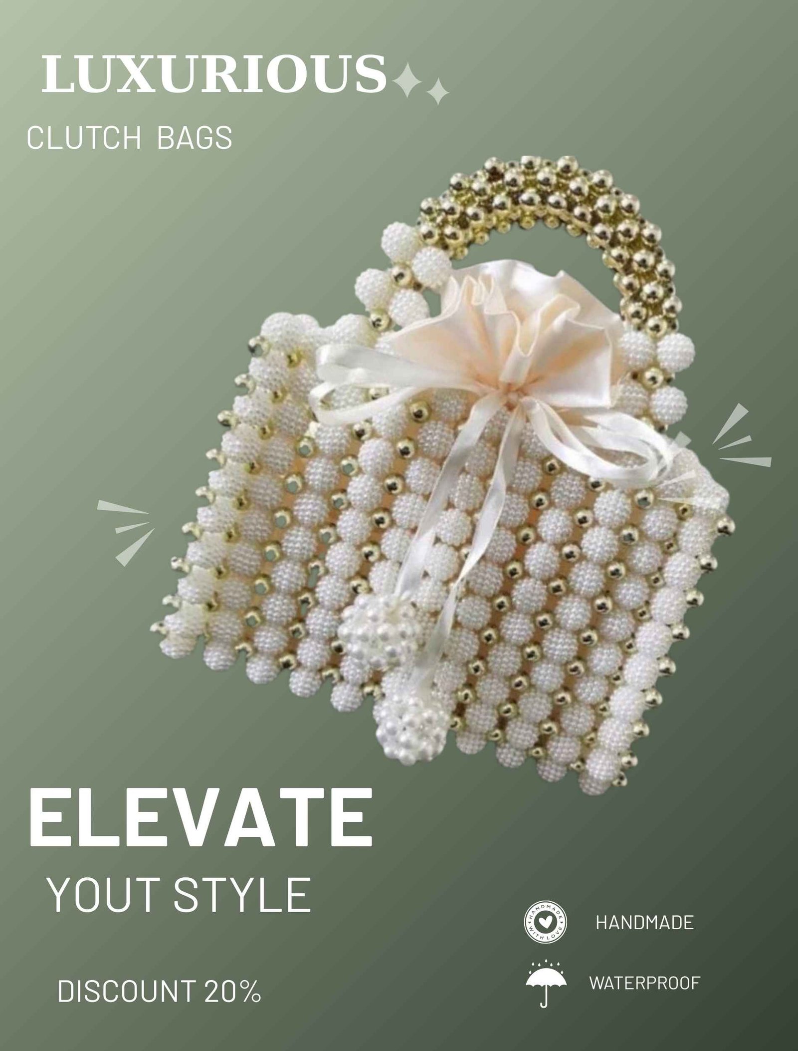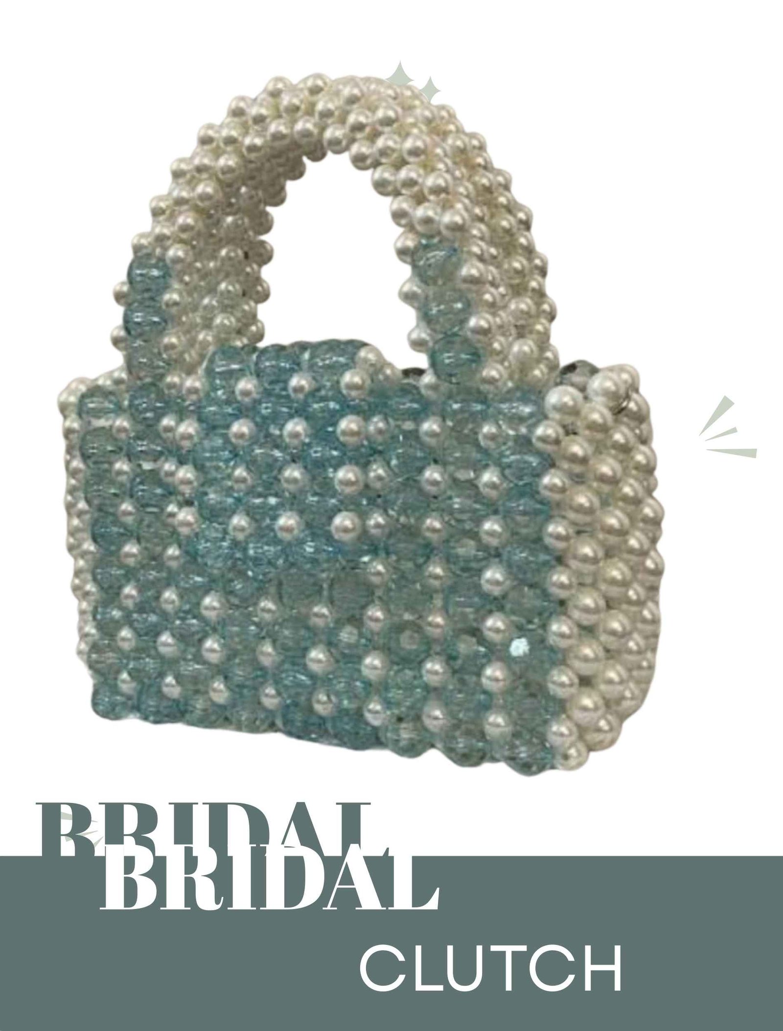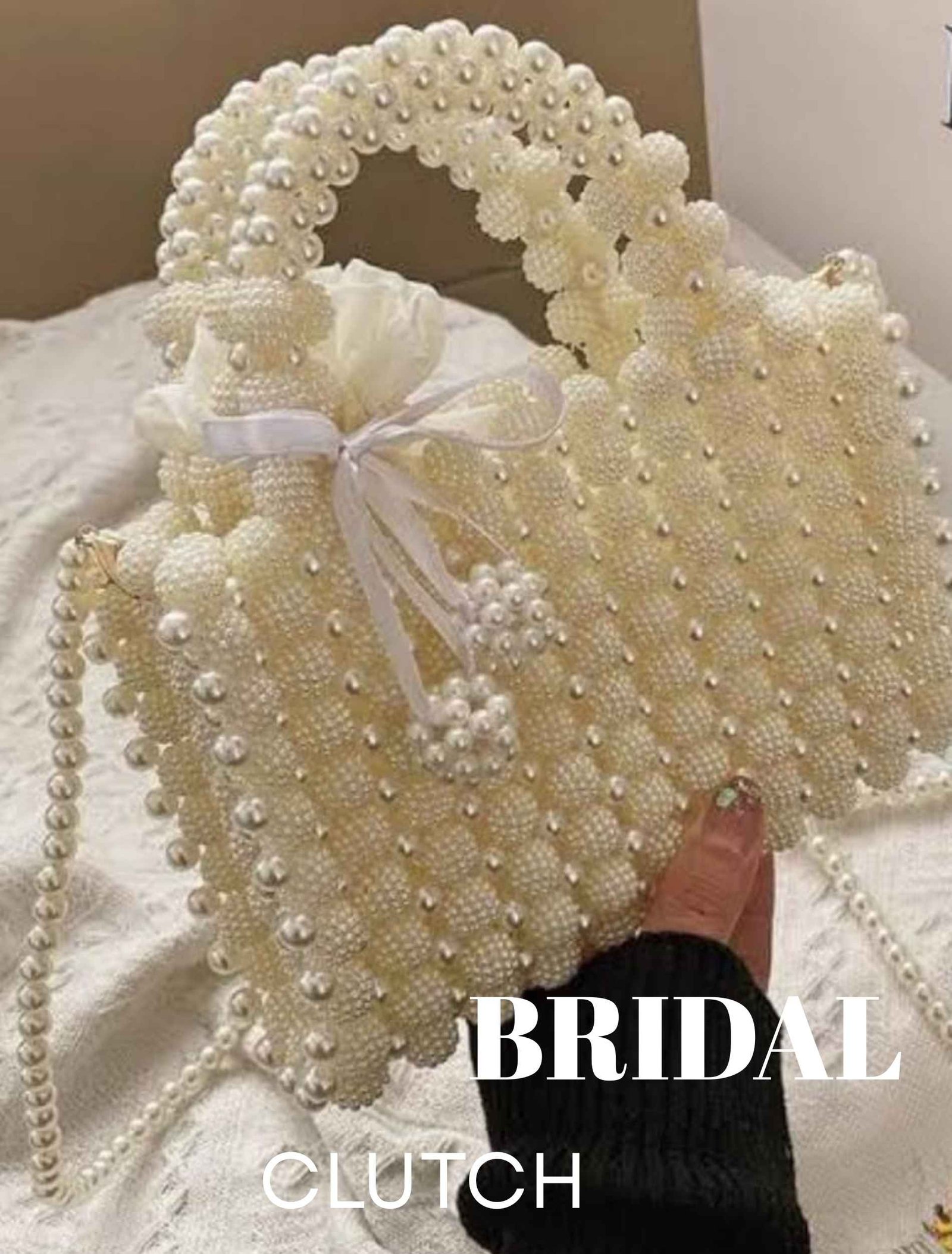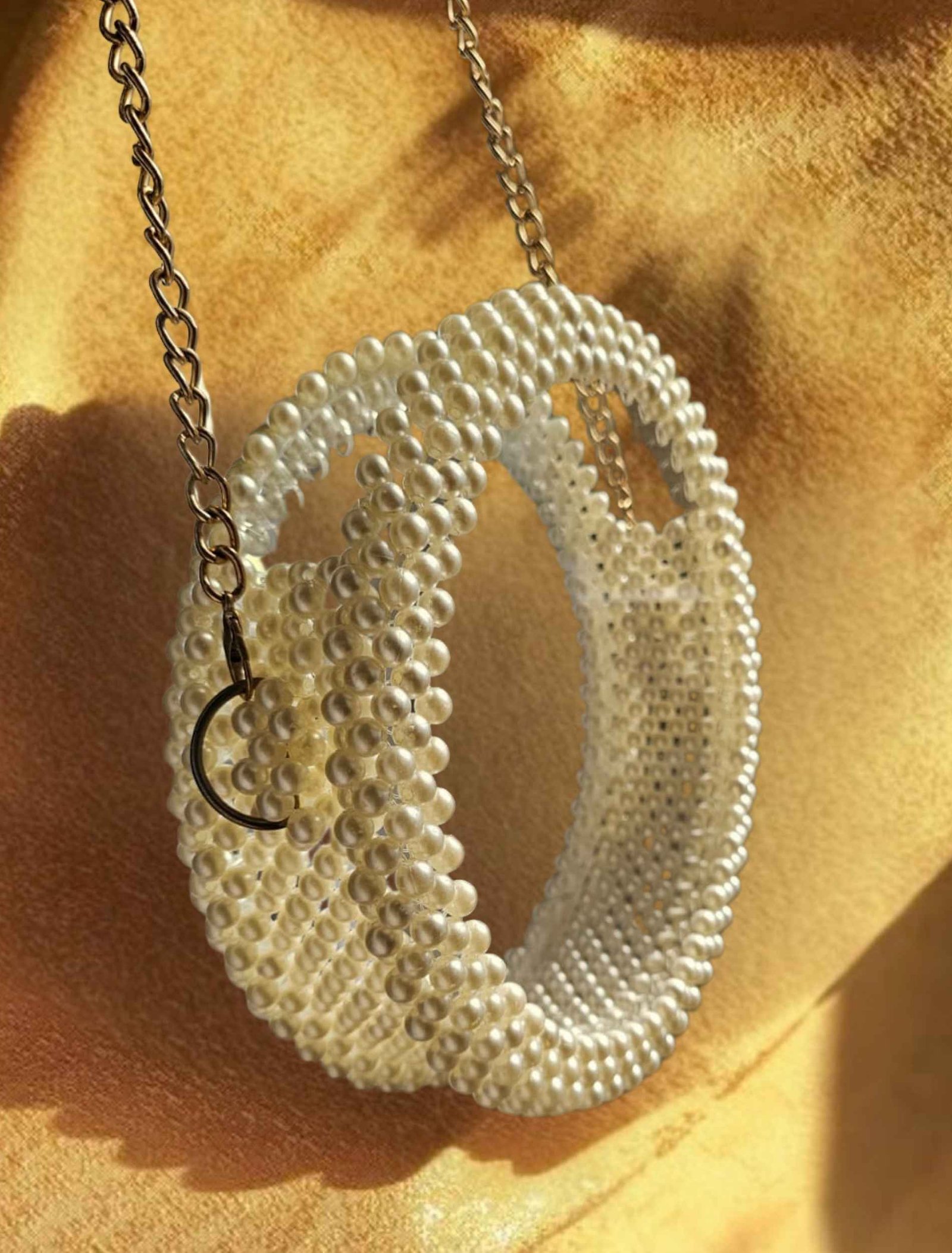 White Round beaded handbag with golden handle and chain strap with name Customization .