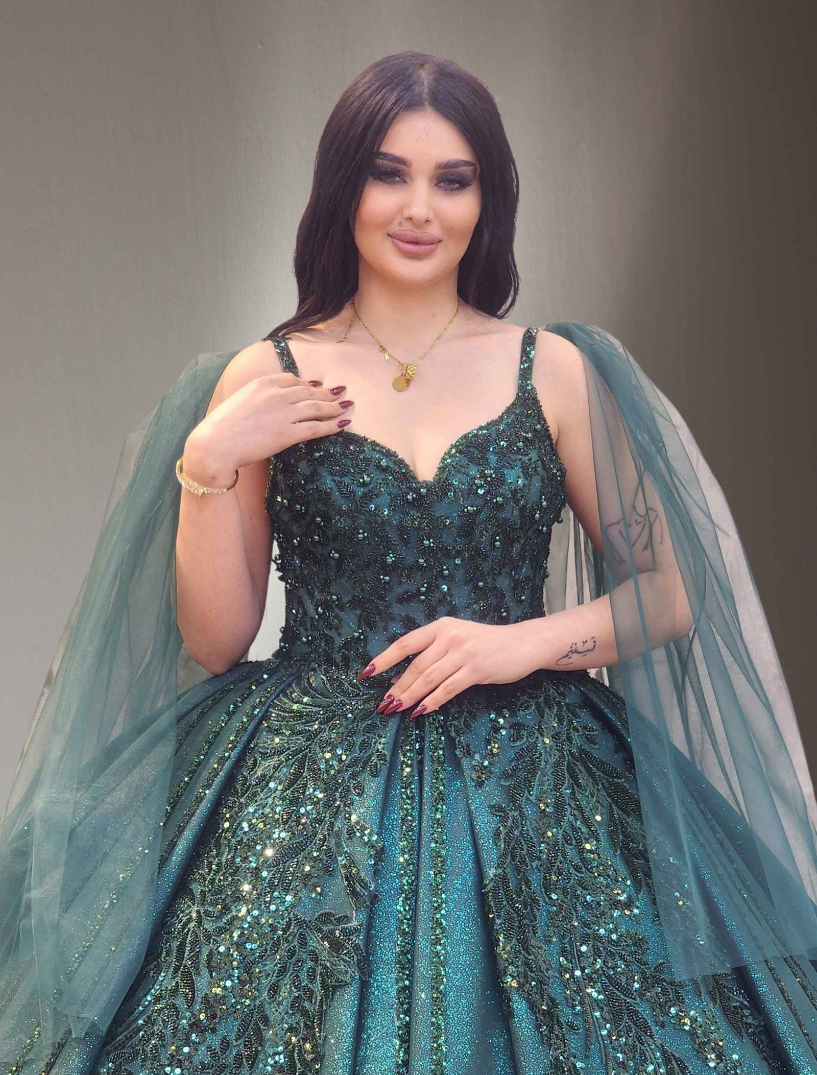 all colors, All products, dark green, dramatic sleeve, emerald green, Engagement Dresses, luxury ball gowns, princess-cut dress, Quinceanera dresses, squined dresses