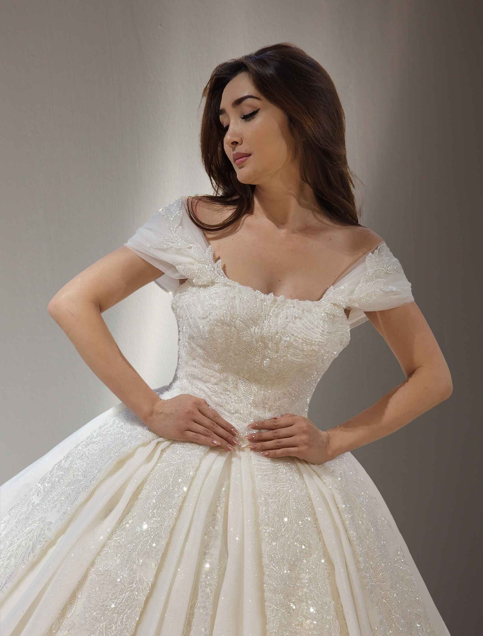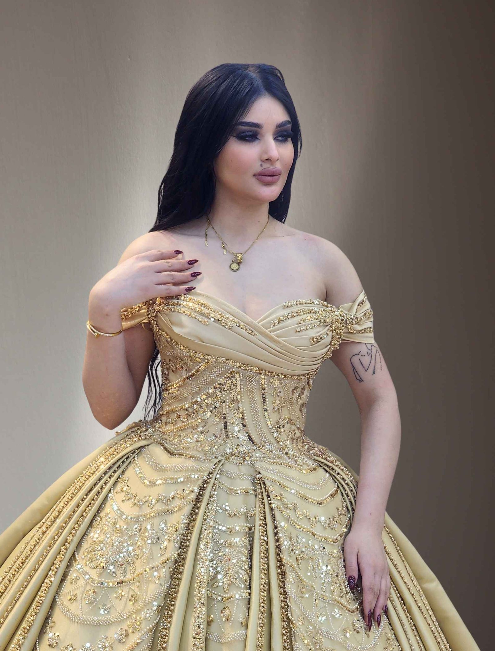 Champagne gold ball gown with off-shoulder neckline and glitter embroidery