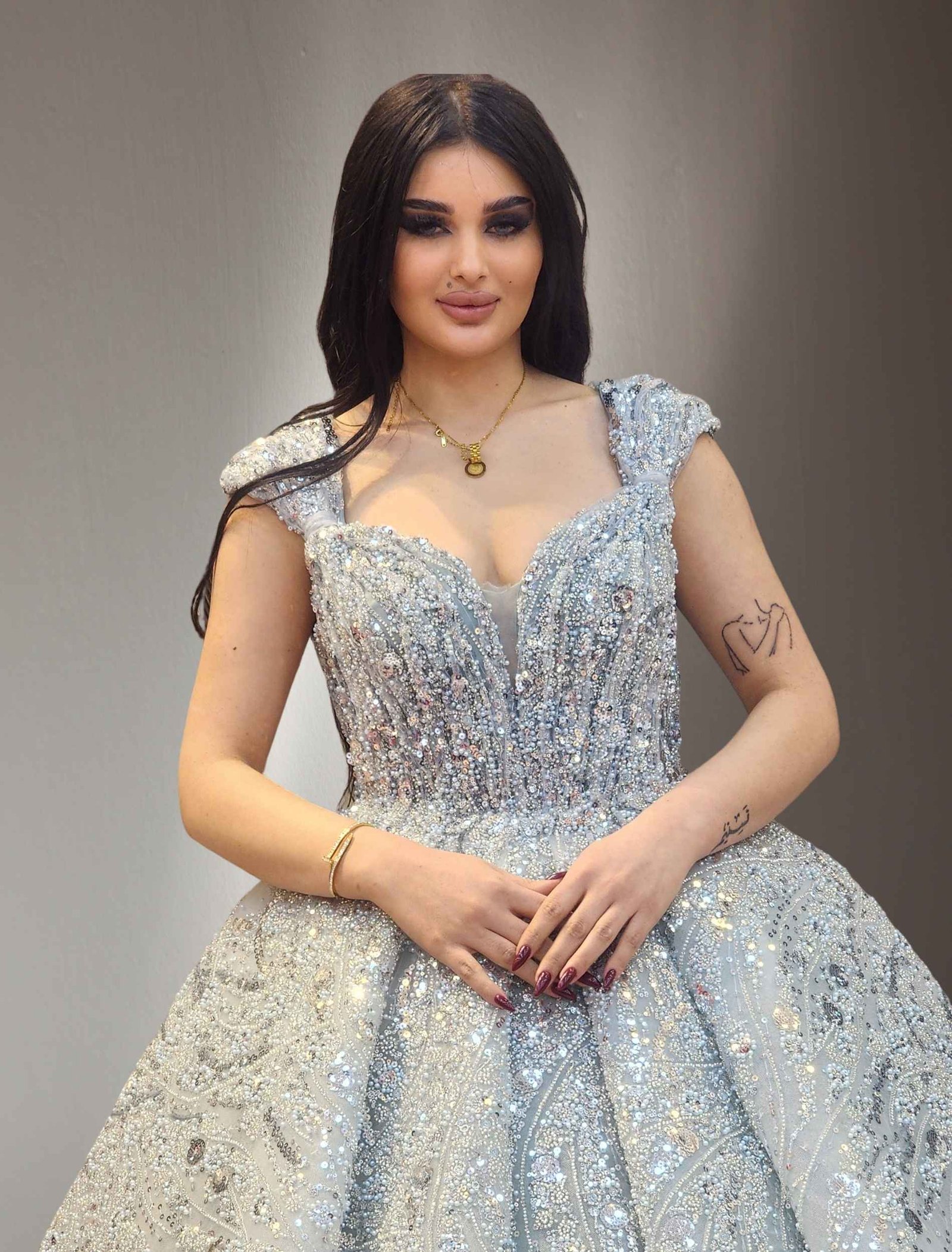 Fairytale-style light blue ball gown with off-shoulder neckline and glitter details.