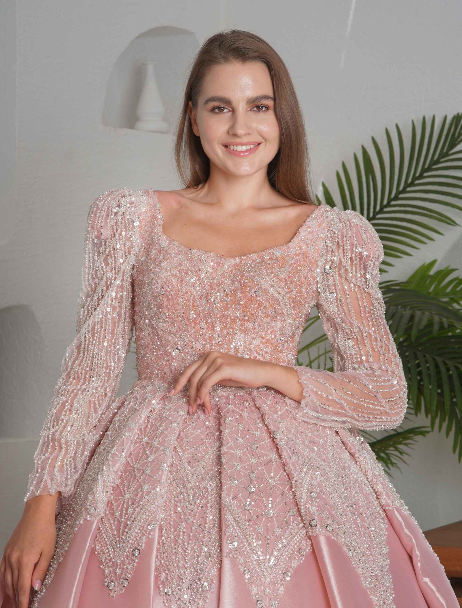 Romantic blush pink ball gown with sheer sleeves and glitter embroidery.