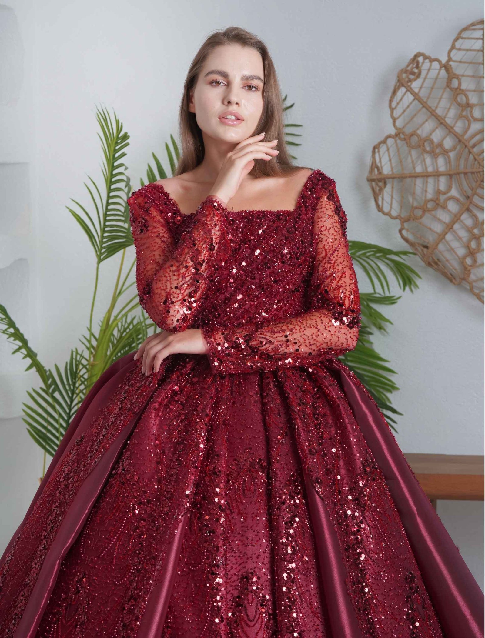 Rich burgundy ball gown with sequin embroidery and long sleeves.