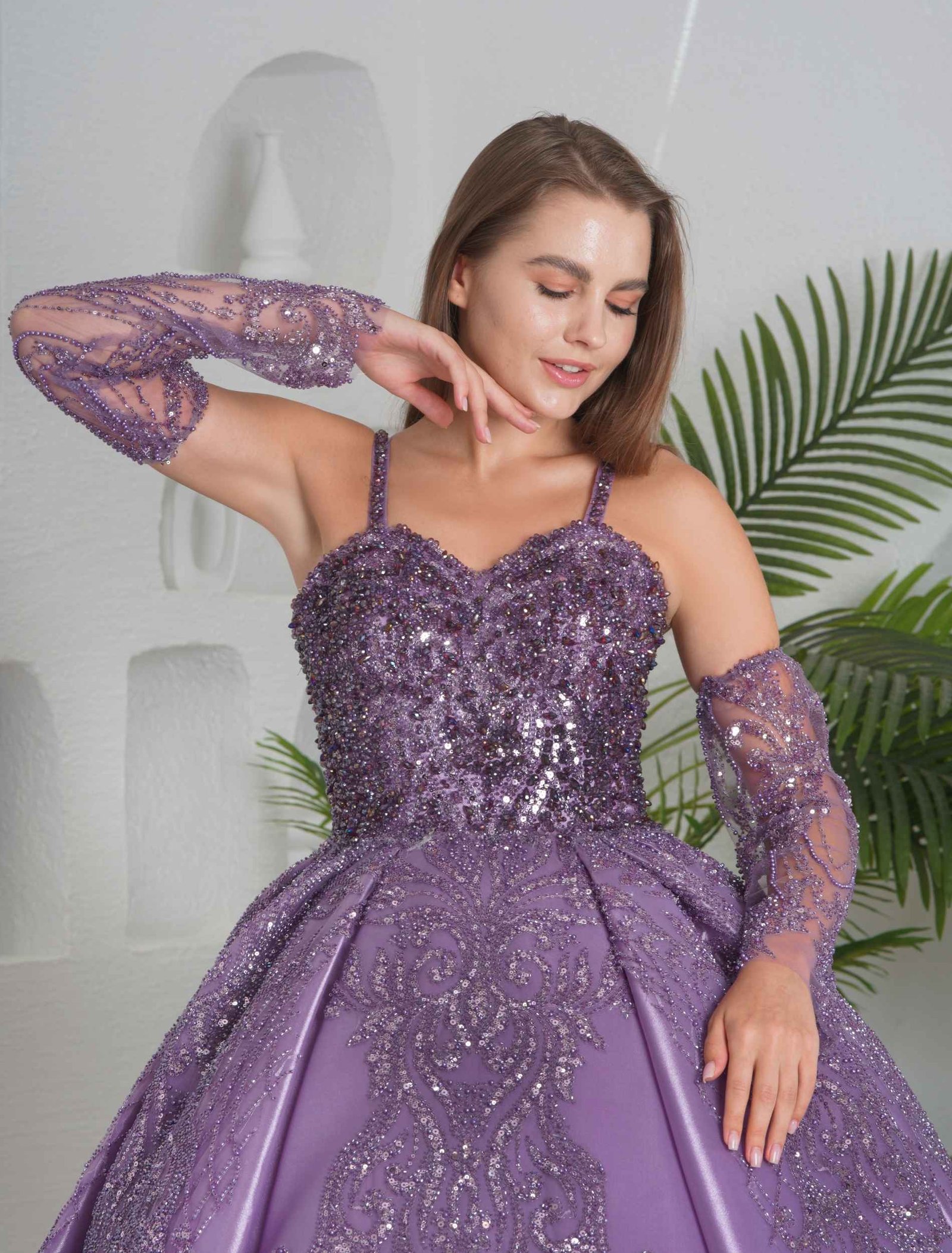 Lavender purple ball gown with glitter embroidery and long sheer sleeves.