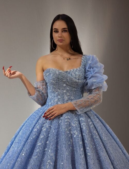 one shoulder embroidered lace ball gown baby blue