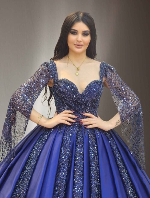 Navy Blue Beaded Ball Gown with long Sleeves