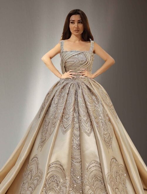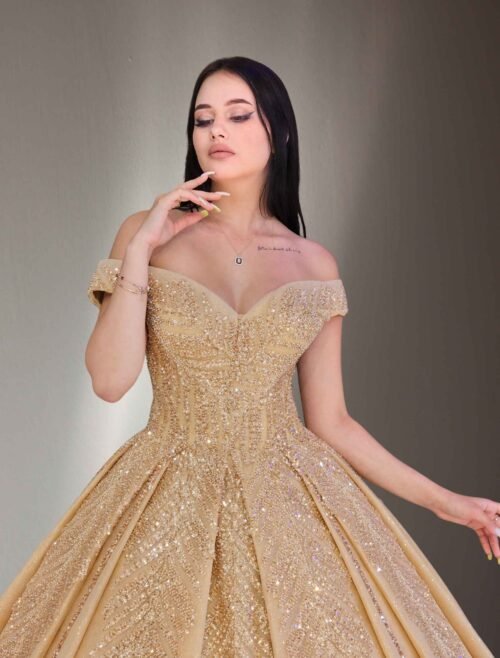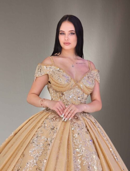 Champagne gold ball gown with off-shoulder neckline and glitter embroidery