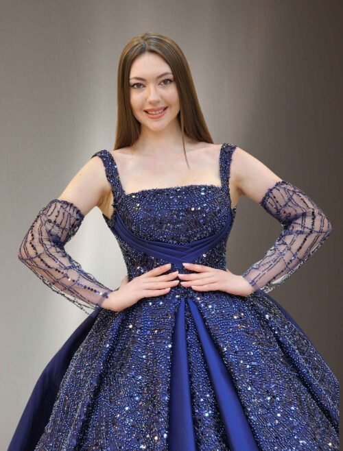 Elegant navy blue ball gown with long sleeves and glitter embroidery.