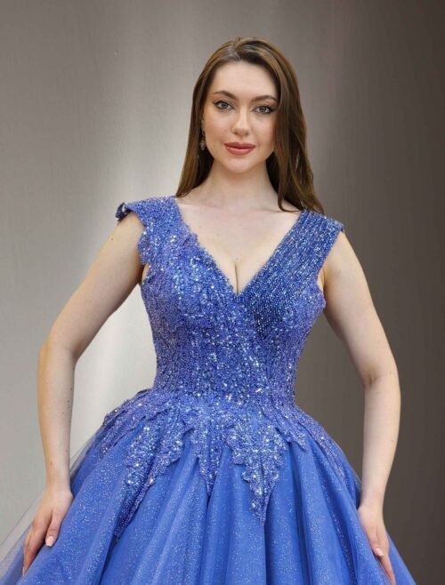 Royal Blue Sparkly Ball Gown with Deep V-Neck