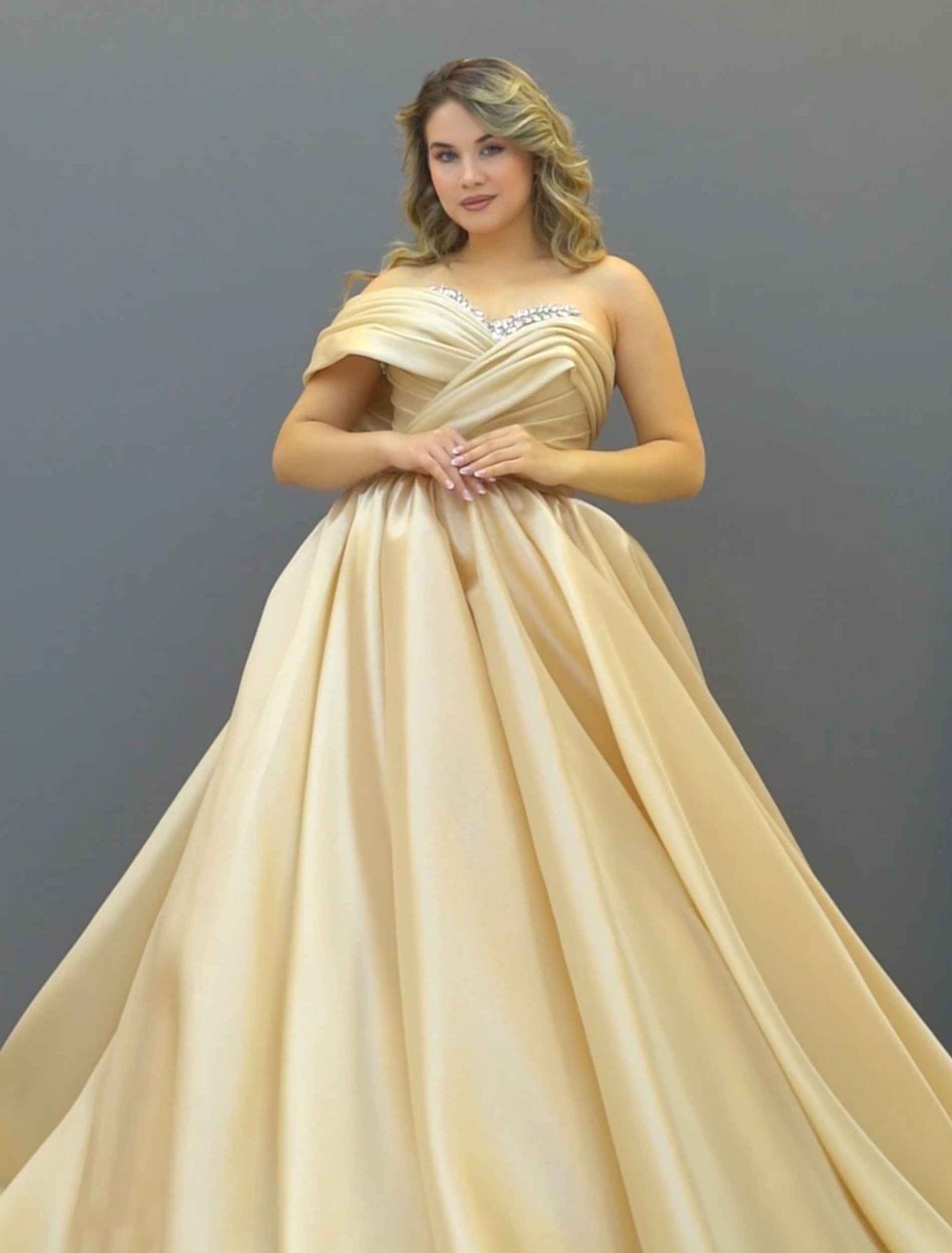 An exquisite champagne gold satin gown with a soft off-shoulder drape and a full skirt for a regal, timeless look.