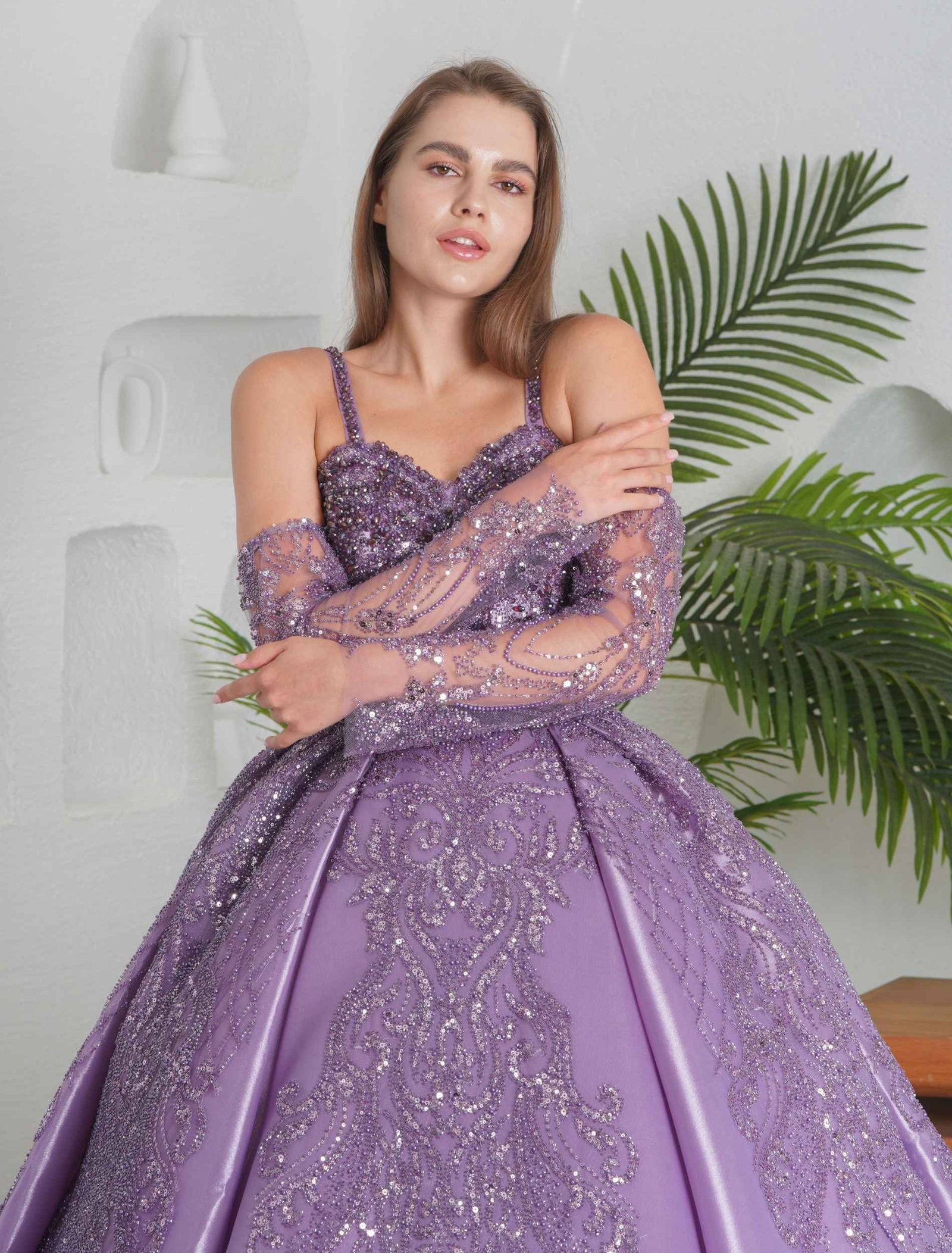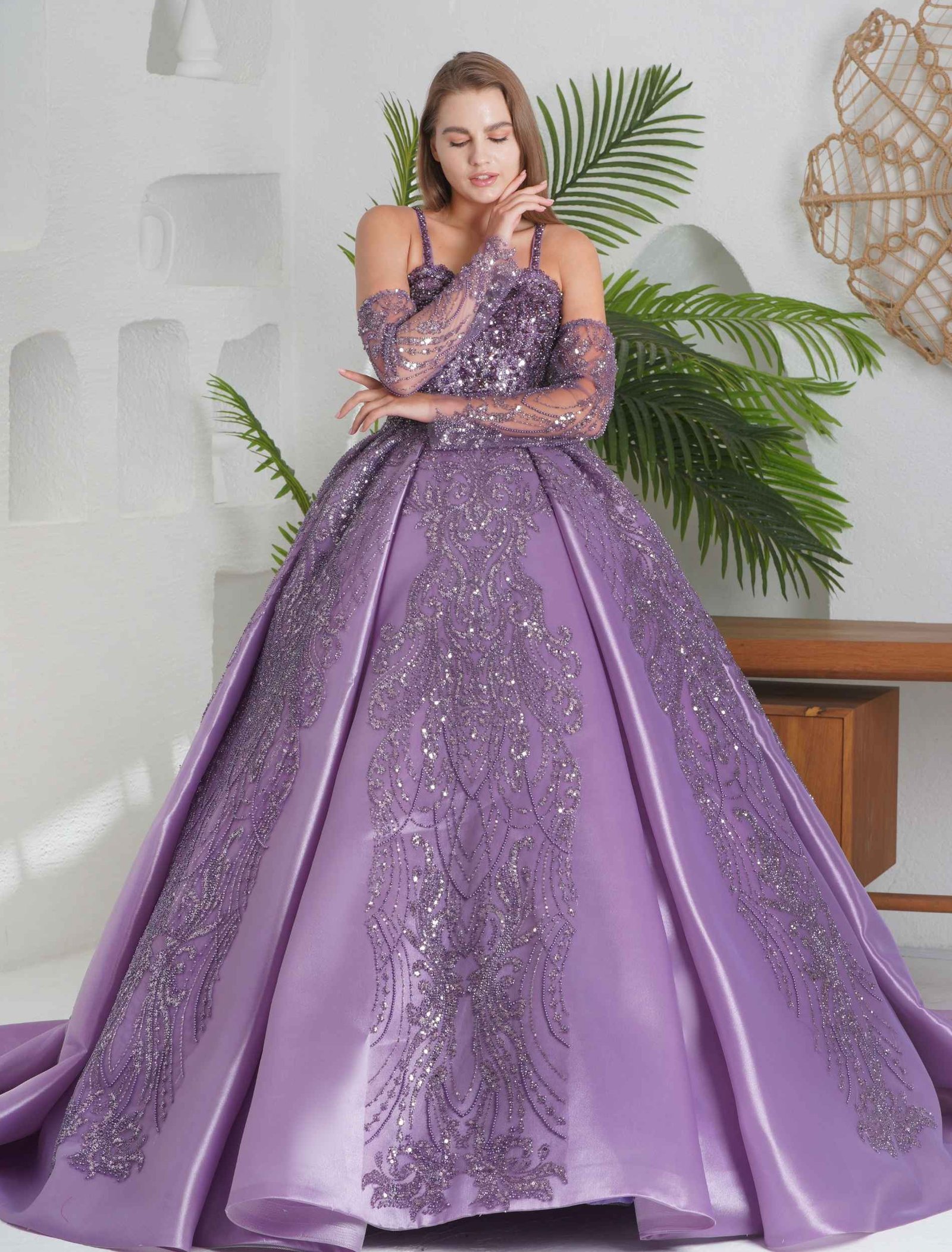 This purple gown features a glamorous bodice with glitter embroidery and long sheer sleeves. The voluminous skirt makes it perfect for evening occasions, prom nights, and engagements.