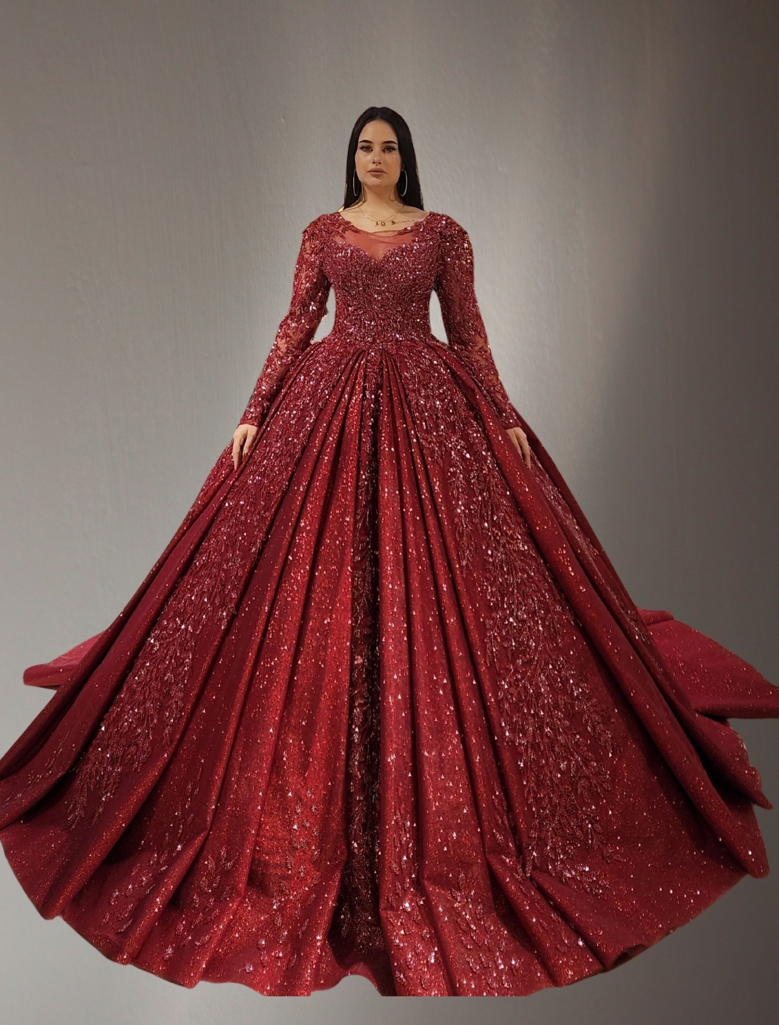 wine red long sleeves ball gown wedding dress adorned with intricate hand-embroidered lace. This elegant silhouette combines timeless luxury with a modern touch. The voluminous skirt creates a royal look perfect for your special day.