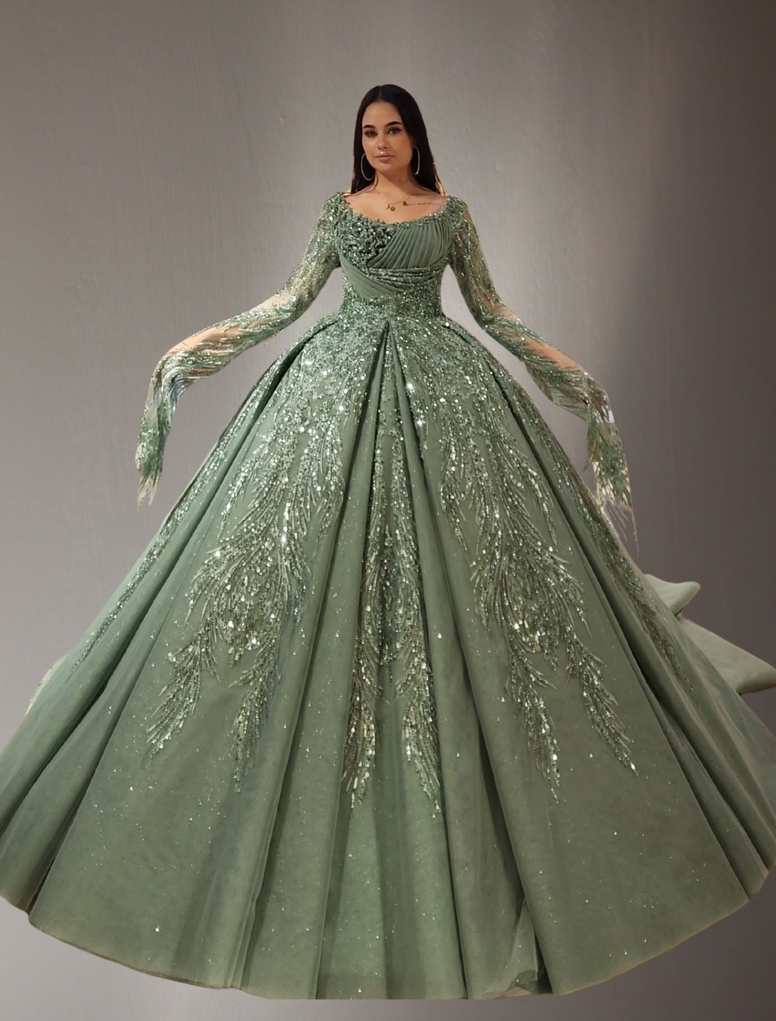 mint green long Sleeves Embroidered princess ball gown adorned with intricate hand-embroidered lace. This elegant silhouette combines timeless luxury with a modern touch. The voluminous skirt creates a royal look perfect for your special day.