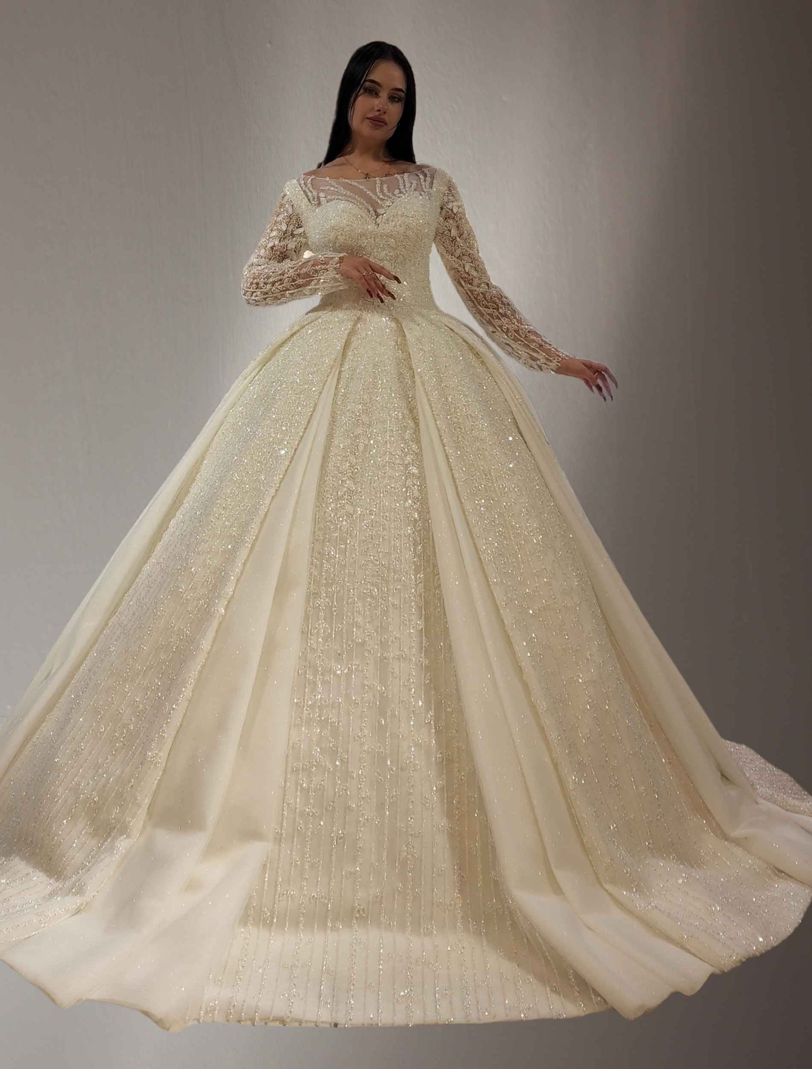A fairytale-inspired ball gown with off-shoulder neckline and puffy embroidered sleeves.