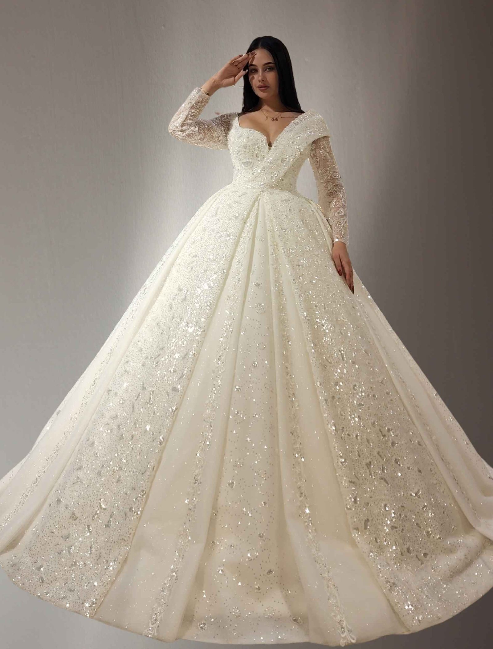 A graceful ball gown with sheer lace long sleeves and delicate embroidery.