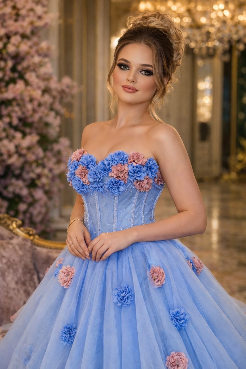 A luxurious blue Starpless floral applique tulle Ball Gown for a graceful and modern royal look.
