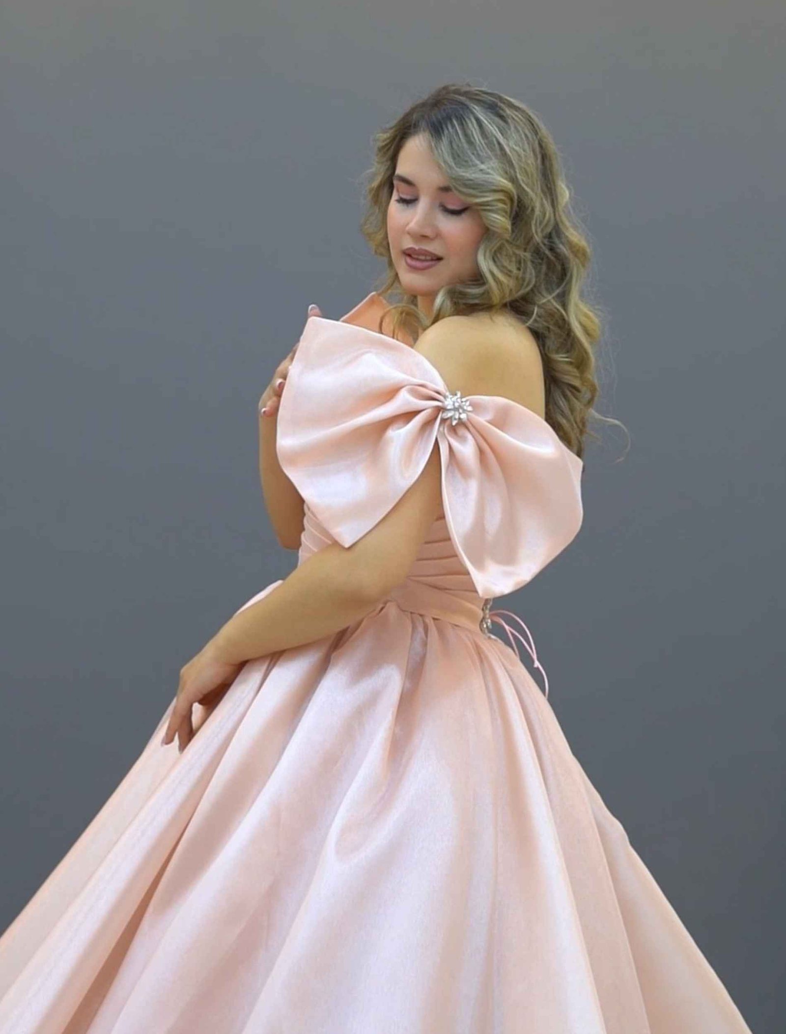 Blush Pink Off-Shoulder Satin Ball Gown