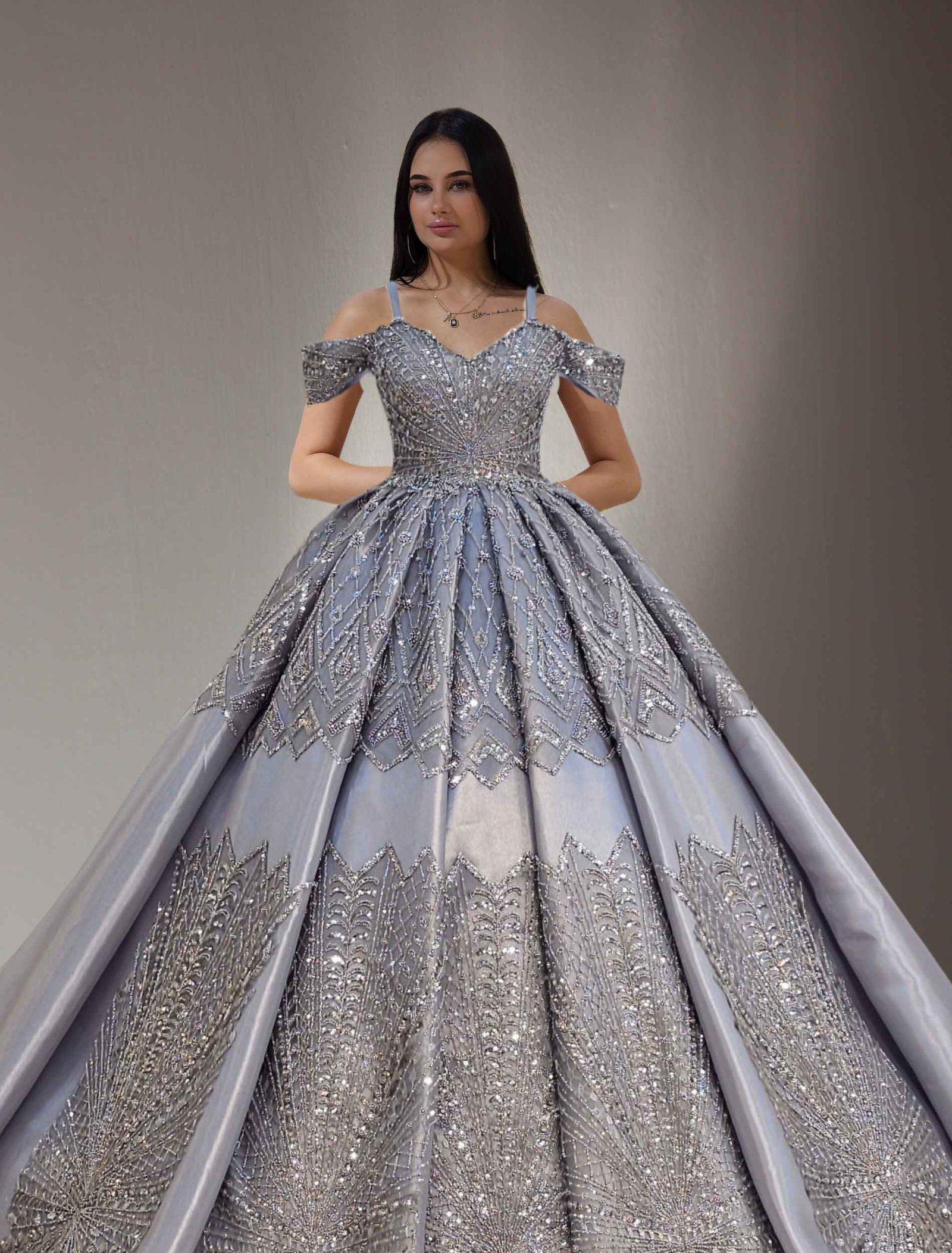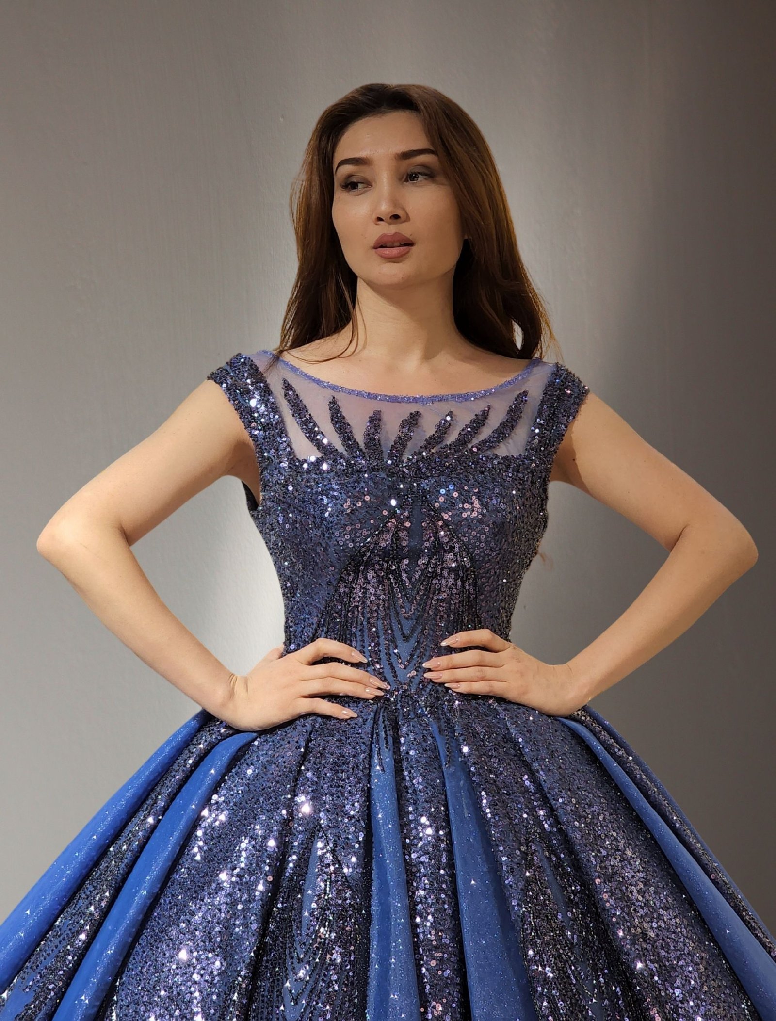 Elegant navy blue ball gown with long sleeves and glitter embroidery.