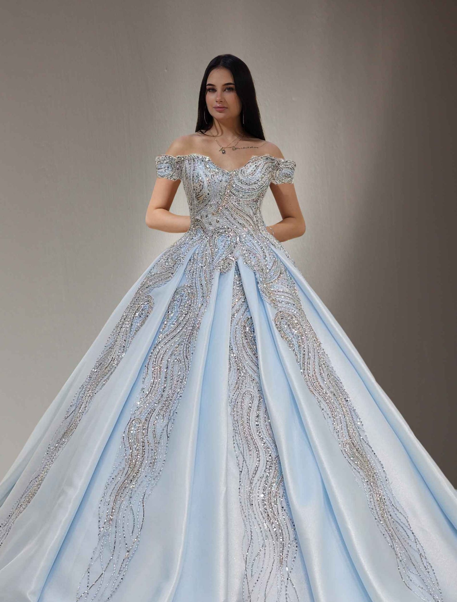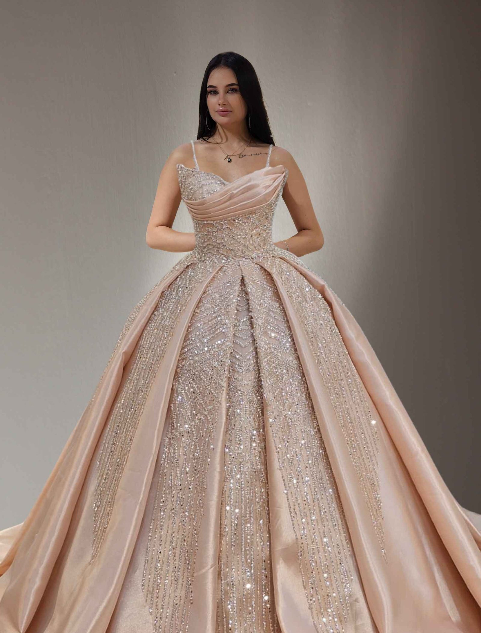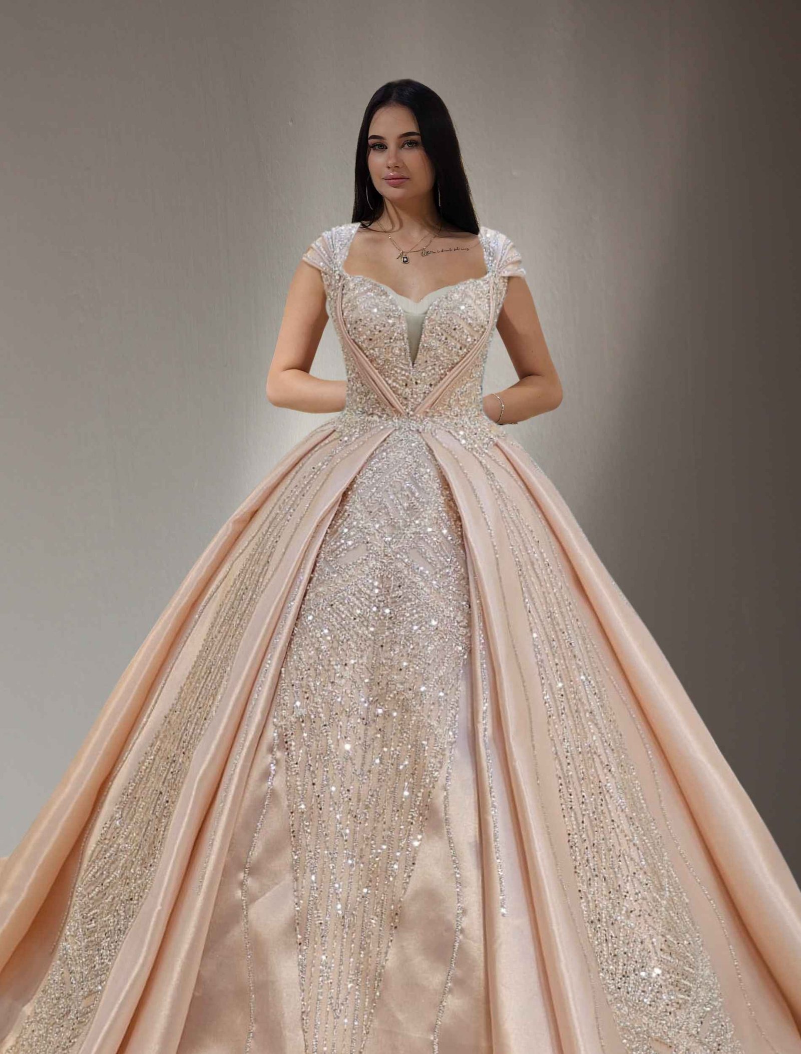 Champagne gold ball gown with off-shoulder neckline and glitter embroidery